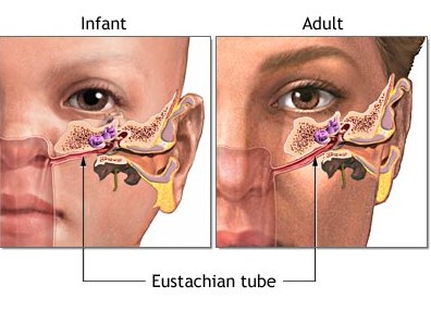 Dysfunction of the Eustachian tube can lead to discomfort when flying.The middle ear is an air-filled space separated from the external ear by the tympanic membrane (ear drum). The Eustachian tube connects the middle ear space to the nasopharynx at the back of the nose. It normally opens with swallowing or yawning and allows equalization of pressure in the middle ear.